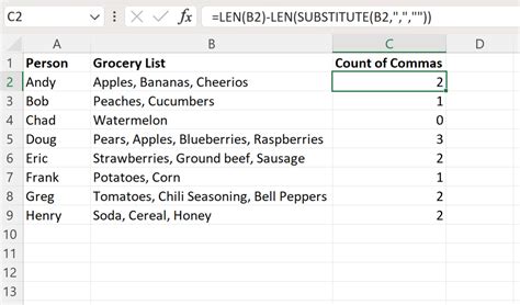 how to count number of commas in a cell in excel